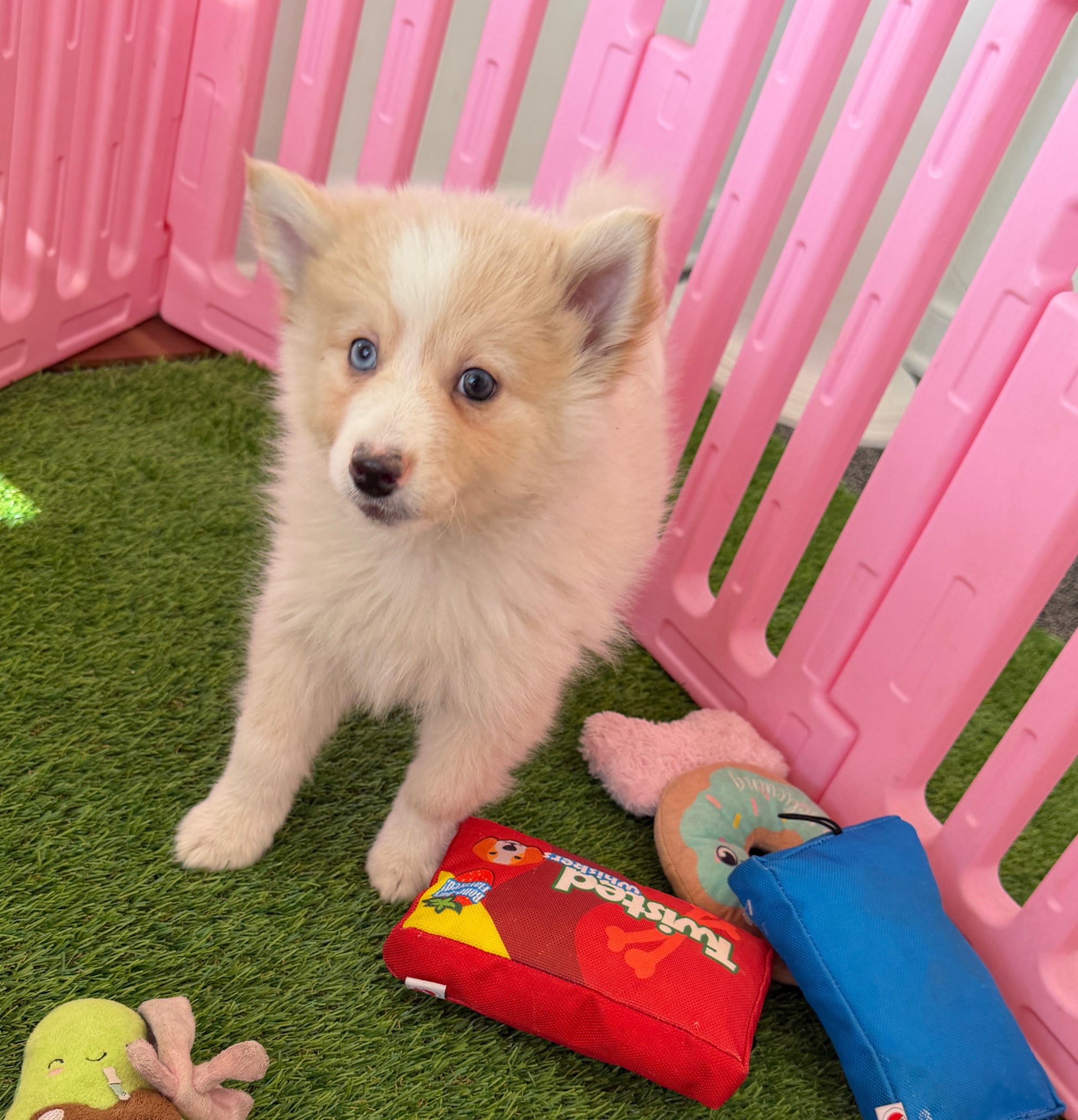 Meet Atlas, our handsome Pomsky boy with a thick, fluffy coat and a confident, steady personality. A beautiful blend of Pomeranian and Husky, Atlas has that bold, winter-dog presence paired with a gentle, affectionate nature.